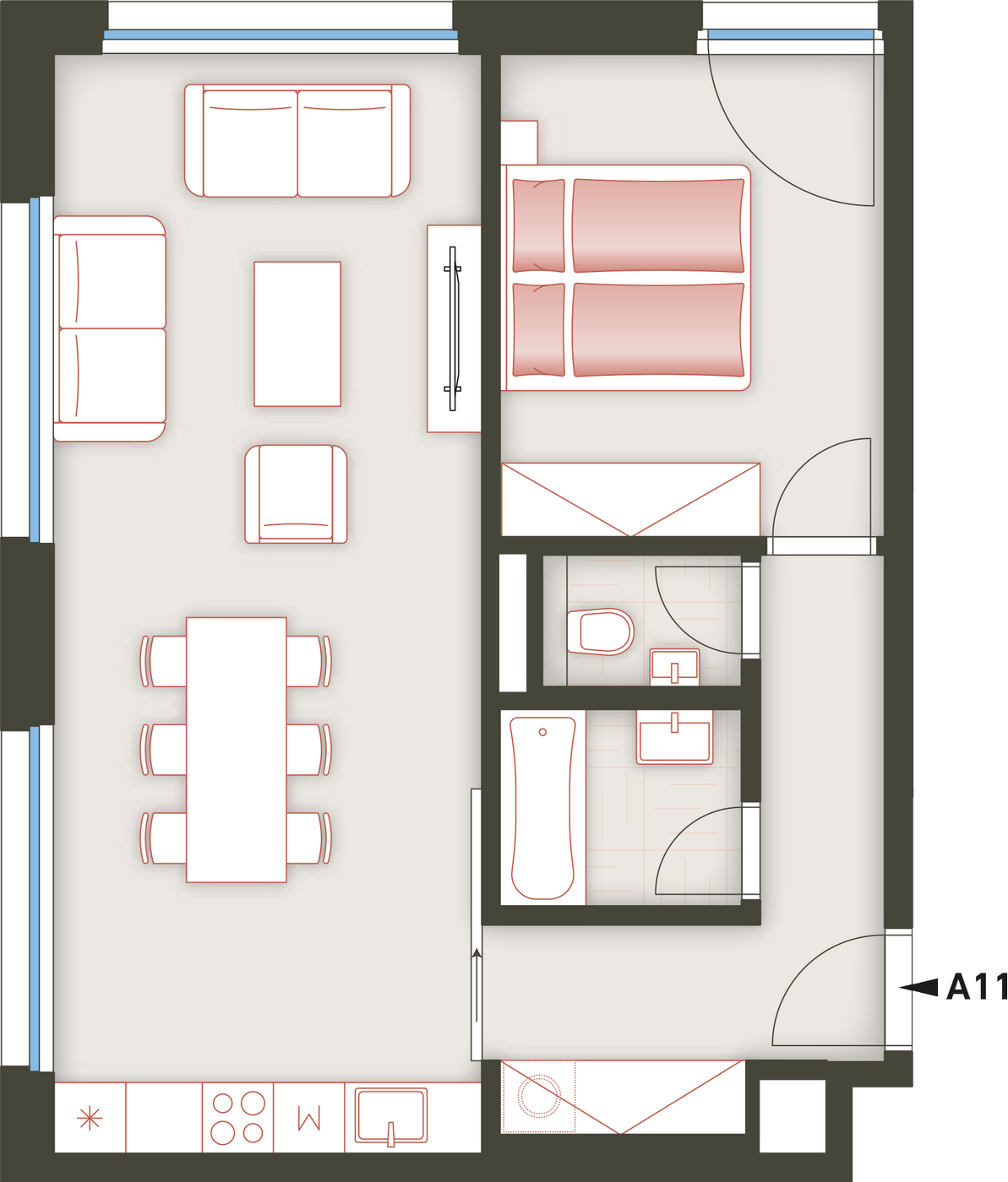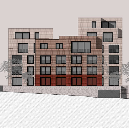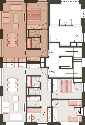 Architektura logické geometrie využívá ušlechtilé nadčasové materiály. Zvenčí je to primárně režné zdivo, které zajišťuje vizuální propojení všech tří bytových domů uzavřeného rezidenčního komplexu.