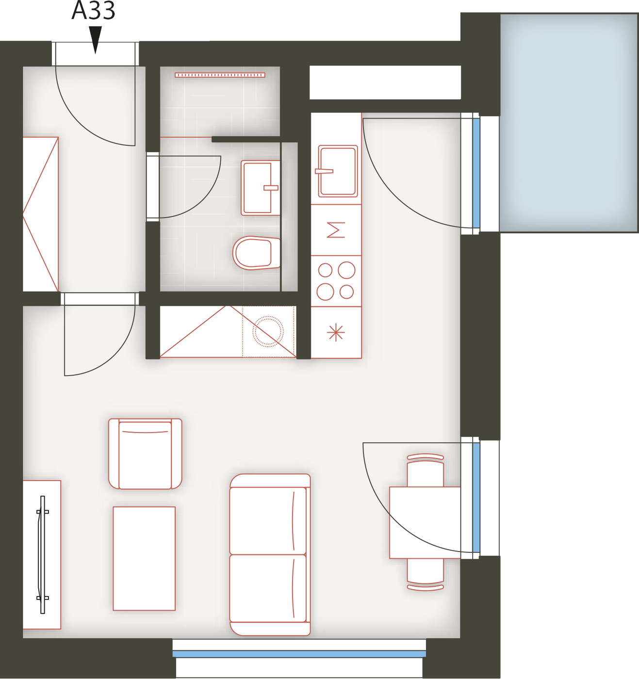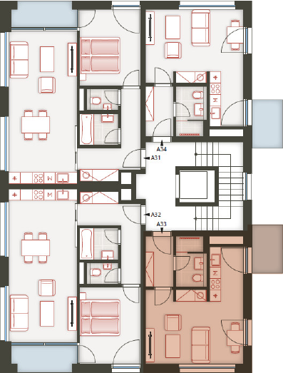Architektura logické geometrie využívá ušlechtilé nadčasové materiály. Zvenčí je to primárně režné zdivo, které zajišťuje vizuální propojení všech tří bytových domů uzavřeného rezidenčního komplexu.
