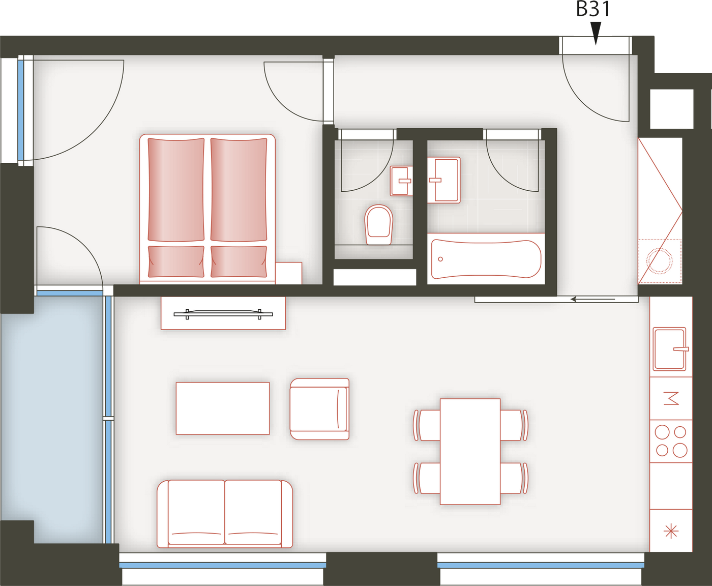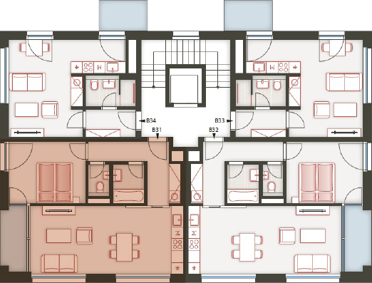 Architektura logické geometrie využívá ušlechtilé nadčasové materiály. Zvenčí je to primárně režné zdivo, které zajišťuje vizuální propojení všech tří bytových domů uzavřeného rezidenčního komplexu.