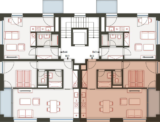 Architektura logické geometrie využívá ušlechtilé nadčasové materiály. Zvenčí je to primárně režné zdivo, které zajišťuje vizuální propojení všech tří bytových domů uzavřeného rezidenčního komplexu.