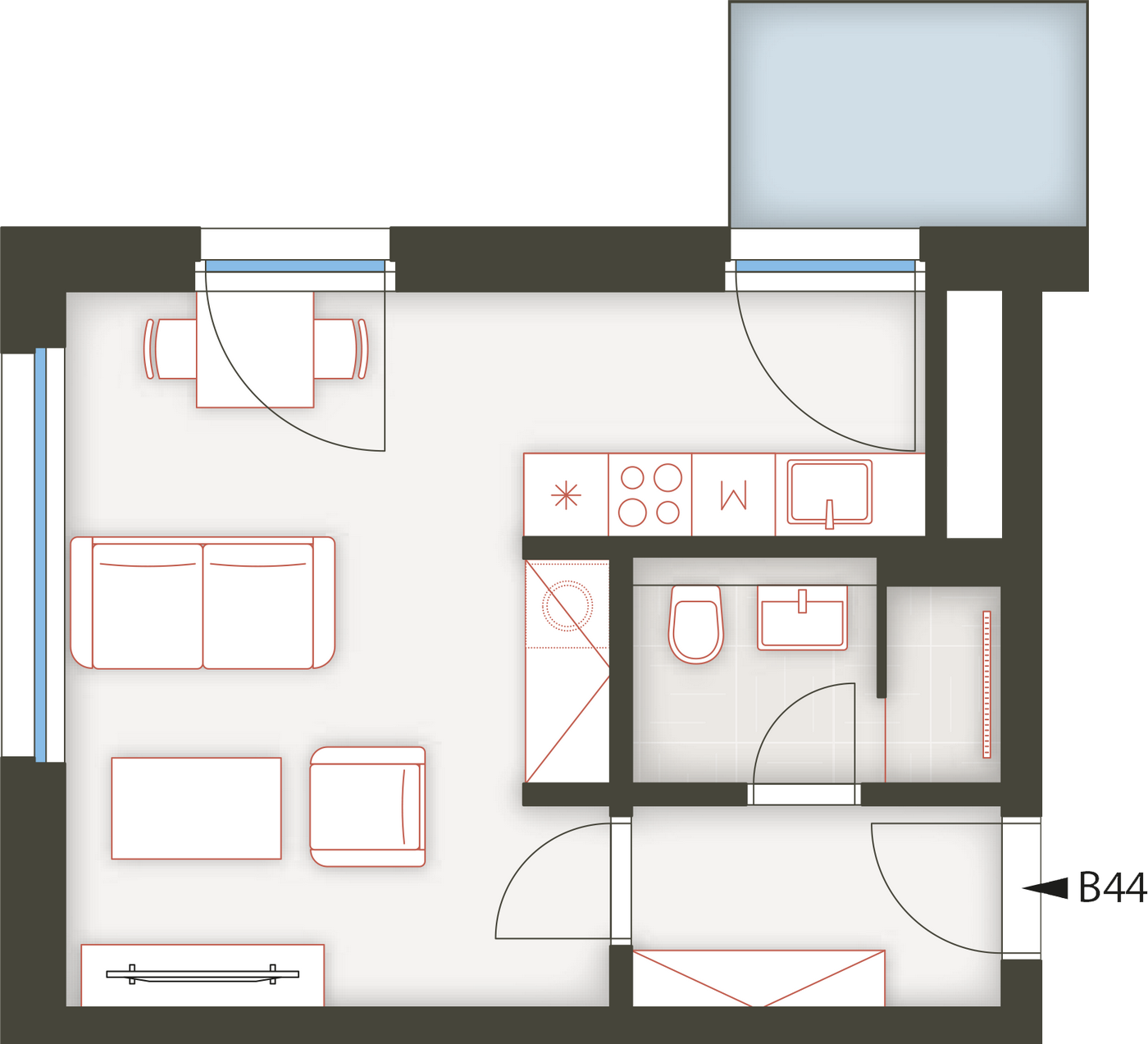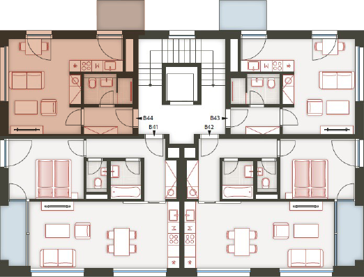 Architektura logické geometrie využívá ušlechtilé nadčasové materiály. Zvenčí je to primárně režné zdivo, které zajišťuje vizuální propojení všech tří bytových domů uzavřeného rezidenčního komplexu.