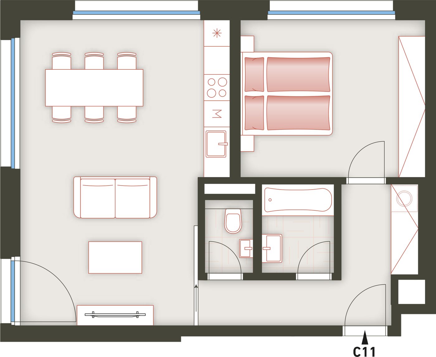 Architektura logické geometrie využívá ušlechtilé nadčasové materiály. Zvenčí je to primárně režné zdivo, které zajišťuje vizuální propojení všech tří bytových domů uzavřeného rezidenčního komplexu.