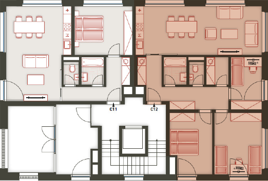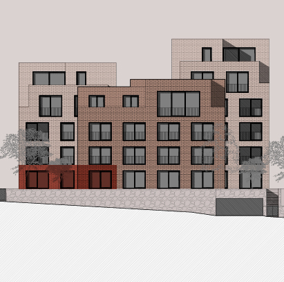 Architektura logické geometrie využívá ušlechtilé nadčasové materiály. Zvenčí je to primárně režné zdivo, které zajišťuje vizuální propojení všech tří bytových domů uzavřeného rezidenčního komplexu.