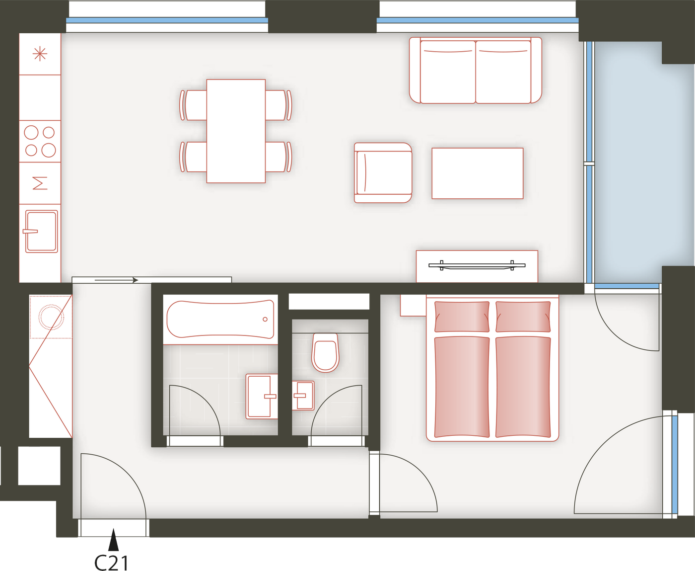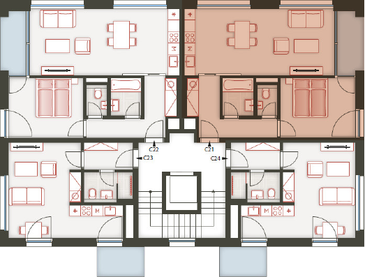 Architektura logické geometrie využívá ušlechtilé nadčasové materiály. Zvenčí je to primárně režné zdivo, které zajišťuje vizuální propojení všech tří bytových domů uzavřeného rezidenčního komplexu.